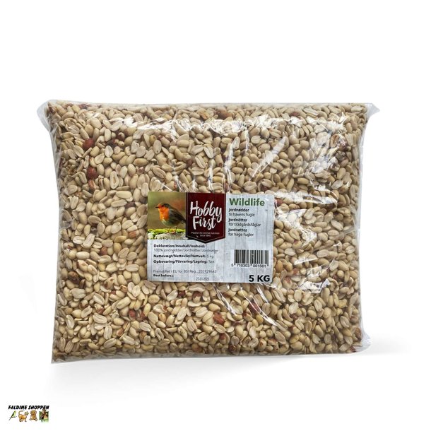 Skallen er pillet af jordnødderne, men de har stadig en tynd brun hinde, som også er næring til fuglen.